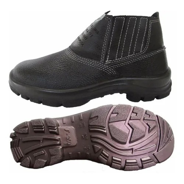 Detalhes do ProdutoCalçado ocupacional básico, modelo botina, constituída de couro, desenho do cabedal tipo (B), fechamento em elástico. Sistema strobel com palmilha de montagem em não tecido e injeção direta do solado no cabedal. Região do salto totalmente fechado, com resistência ao escorregamento, solado bidensidade.