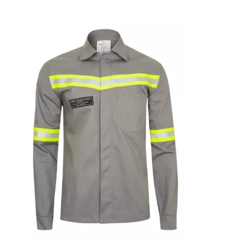 Camisa com abertura frontal, fechamento com botões anti-chama e pala protetora, gola calorim esporte com pé de gola, punho com carcela e botão ou elástico, com faixa refletiva, com ou sem bolso frontal, identificação do EPI, RISCO E ATPV bordados;