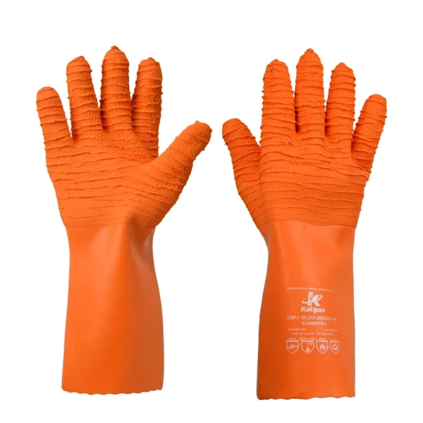 As luvas de proteção Sumatra é confeccionada em algodão tipo interlock, com revestimento total reforçado em látex natural na face palmar, dedos, dorso e punho. Acabamento corrugado na palma, dedos e dorso. Punho com acabamento reto.