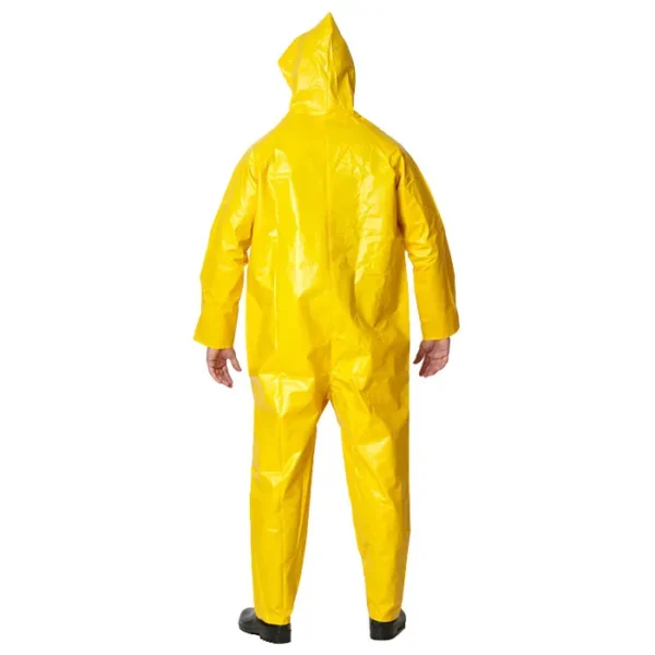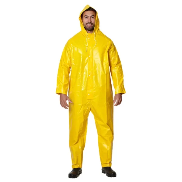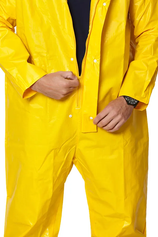 Macacão de segurança confeccionado em tecido sintético plastificado em PVC, soldado eletronicamente, com capuz fixo, fechamento frontal por meio de zíper e botões de pressão, mangas longas.